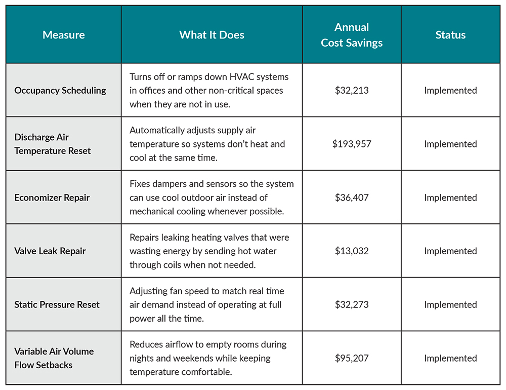 While the table above summarizes each measure and its savings, the results were achieved through careful sequencing, room-by-room system review, and close coordination with facility staff. The examples below take a closer look at several key measures and how and why they were implemented.